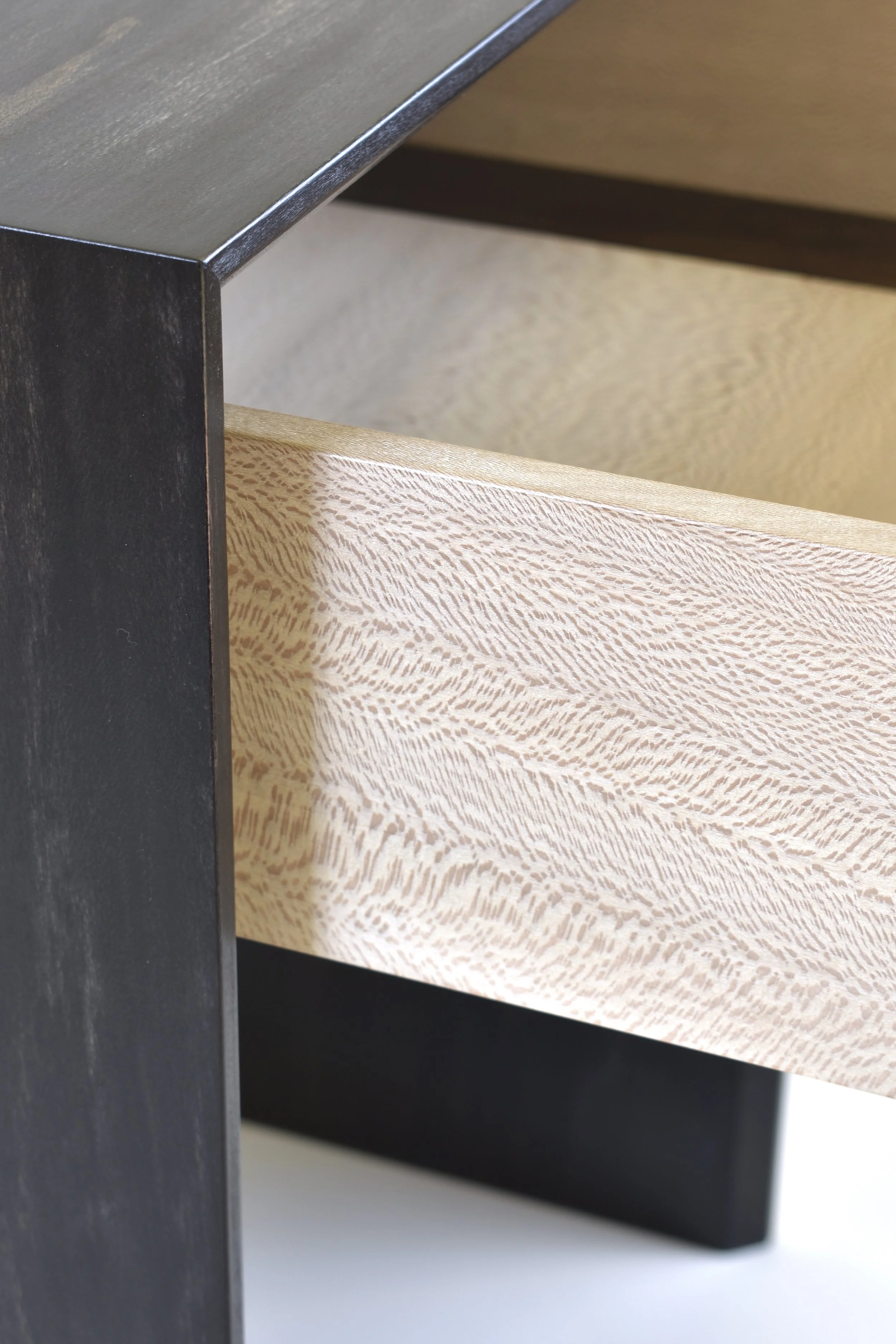 In a departure from previous variants of the material, the top layers here have been variably tinted to lend the pieces a vintage luxury feel and impart a sense of ageing. Dark stained and hand-rubbed French plane wood forms the simple linear cabinet carcases, with boards cut and mitred so that the wood grain flows uninterrupted up, over and down the opposite side of each piece. Plane wood is such a naturally beautiful and varied timber, due to the way the grain presents itself through different angles of milling cuts. To show off this versatility, the drawers themselves present three variations all from the same tree: quartersawn lacewood, iron-stained, and lye-whitened. Drawer construction is traditional with dovetailed joinery, solid bases and drawer slips, but for ease of use and full extension these are supported on hidden Blum soft-close runners.