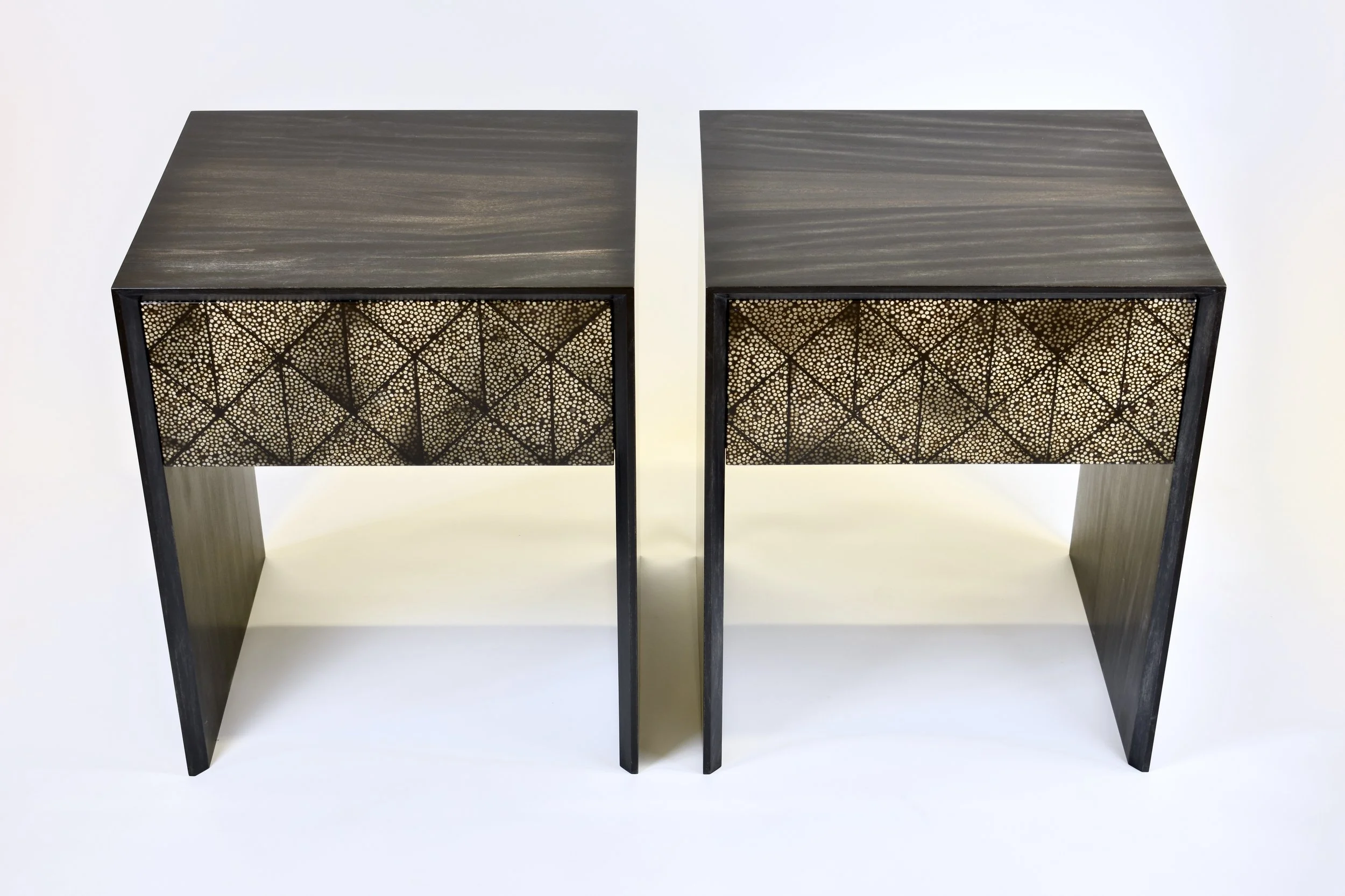 Isosceles is a pair of bedside cabinets fronted in Laurent’s bespoke Piper whole black peppercorn finish. Reminiscent of traditional luxury shagreen surfaces, the peppercorn material has in this instance been applied in tessellated triangular tiles, each of which is a corner offcut from a commissioned set of octagonal dining placemats commissioned by a famous New York architect’s firm, re-imagined, re-used, re-ordered and re-assembled into new surfaces. Too good to discard.