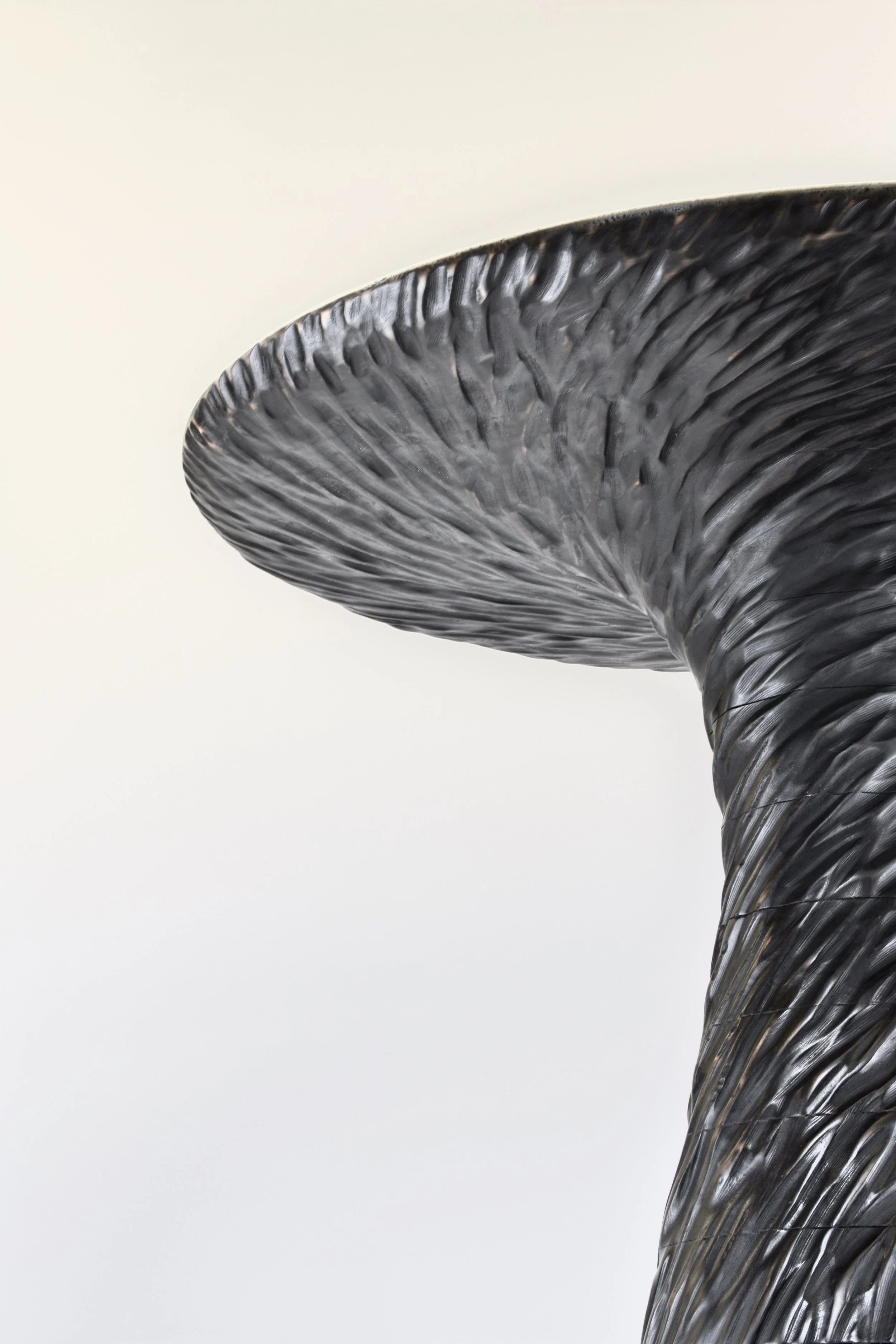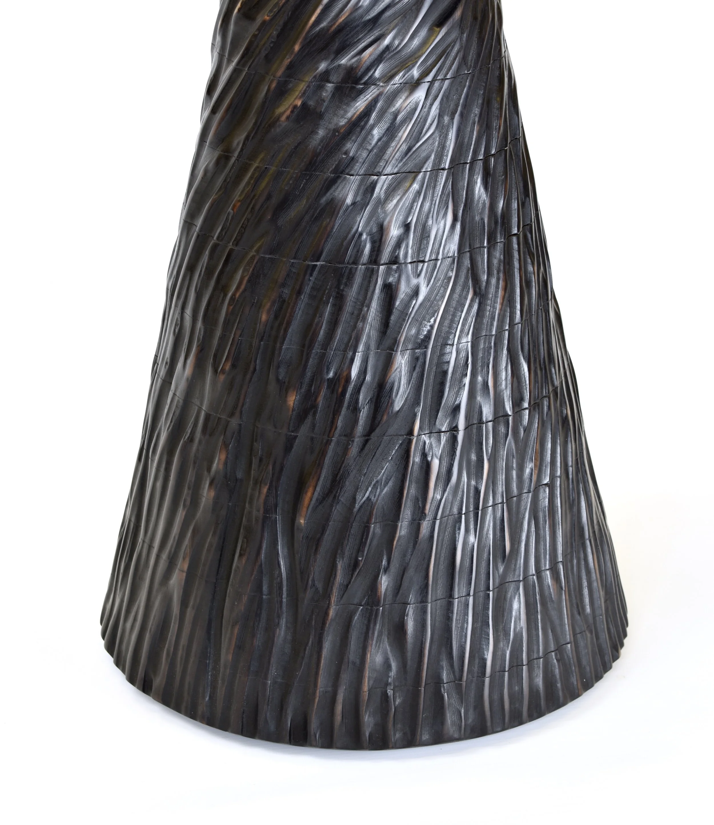Texture is carved in a spiral pattern, swirling from the underside of the top down to a more vertical arrangement as it reaches the ground
